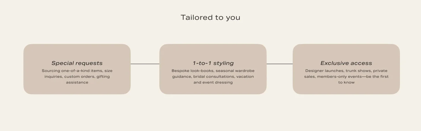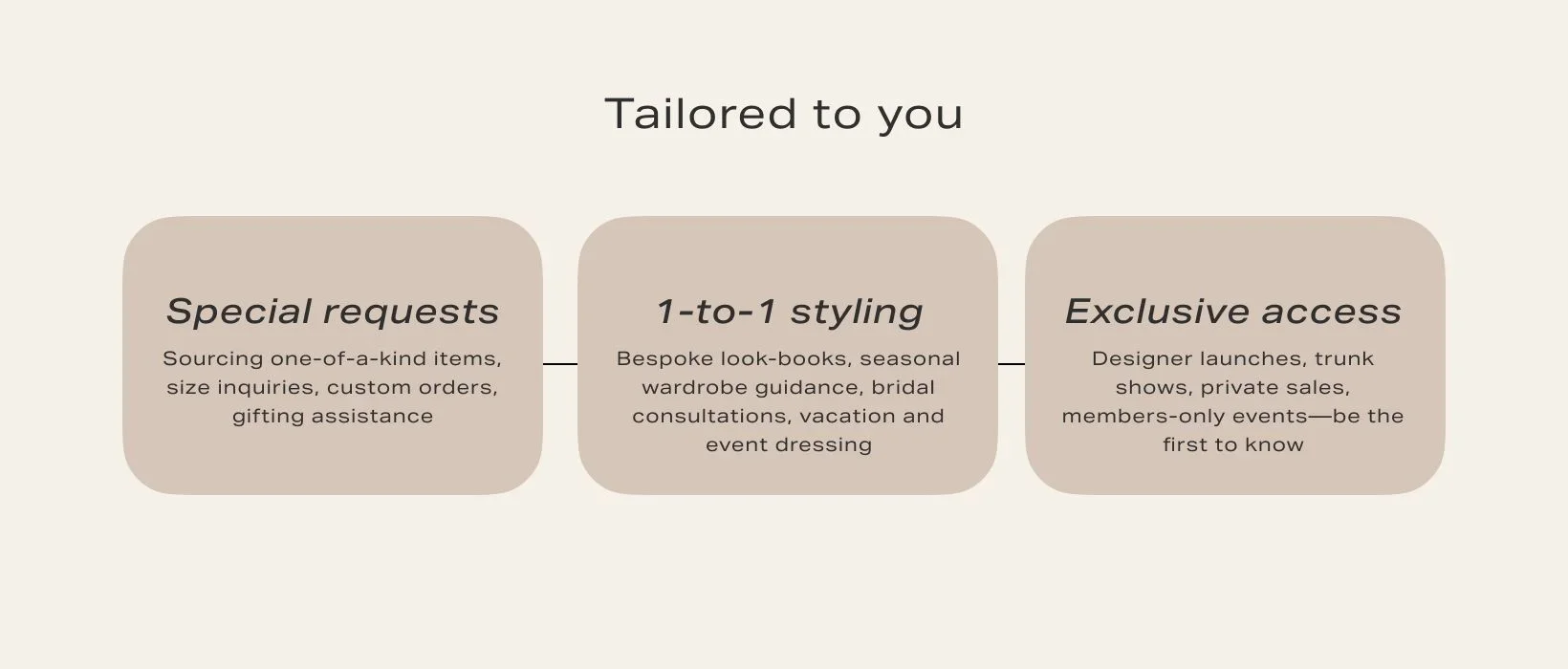 Elevate your shopping experience with exclusive, invite-only access to a dedicated Personal Shopper or Stylist. Whether you’re in search of a unique piece or curating a capsule wardrobe, your every need will be expertly handled.